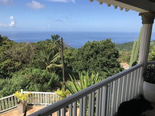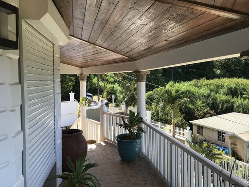 On the highest floor, there are two additional private rooms available for rent. Guests here get to enjoy use of a spacious living area, well-equipped kitchen, dining room, and charming porch offering sweeping views of the Caribbean Sea and green mountain landscapes from a lofty height.